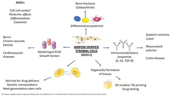 Adipose-Derived Mesenchymal Stromal Cells in Basic Research and Clinical Applications. Open access from the Creative Commons Attribution (CC BY) license (https://creativecommons.org/licenses/by/4.0/). Source: Czerwiec K, Zawrzykraj M, Deptuła M, Skoniecka A, Tymińska A, Zieliński J, Kosiński A, Pikuła M. Adipose-Derived Mesenchymal Stromal Cells in Basic Research and Clinical Applications. International Journal of Molecular Sciences. 2023; 24(4):3888. https://doi.org/10.3390/ijms24043888